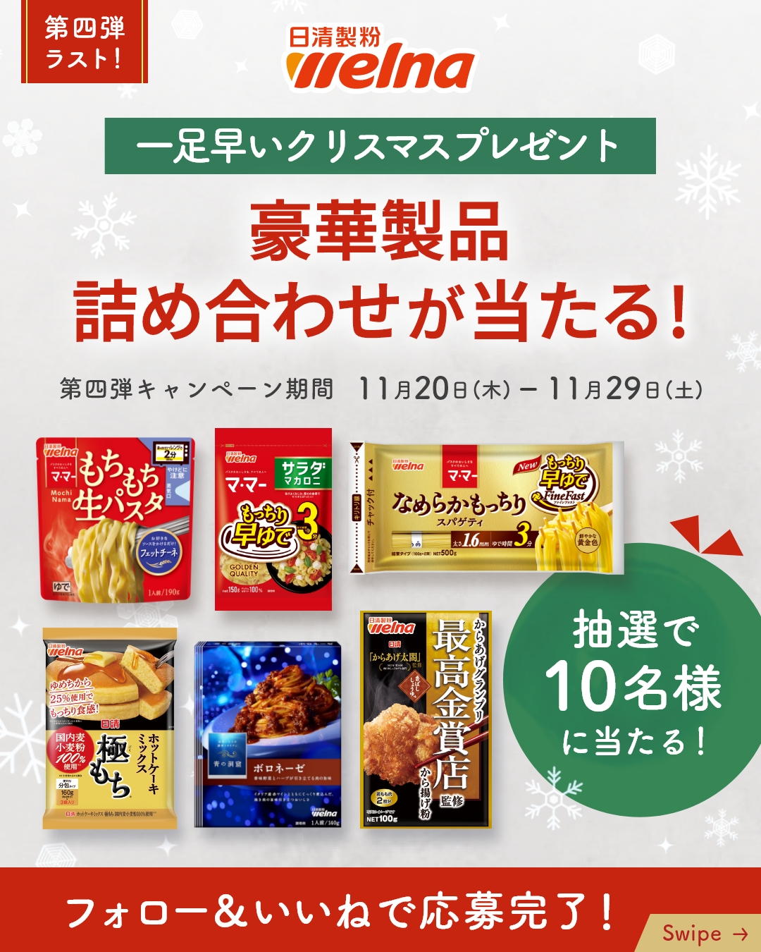 「日清製粉ウェルナ」公式Instagramをご覧いただきありがとうございます☺ 皆さまへ日頃の感謝を込めて、本キャンペーンにご応募いただいた方の中から抽選 で”10名様”に、日清製粉ウェルナ新製品詰め合わせセットをプレゼント🎁
