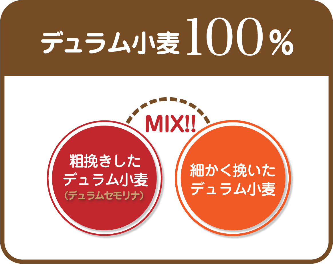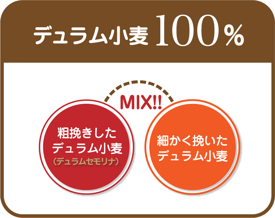 デュラム小麦のセモリナに加えて、デュラム小麦を通常の小麦粉のようなキメ細かい粒度にしたものを使用することで、なめらかでもっちりとして特徴のある、おいしいパスタに仕上がっています。
