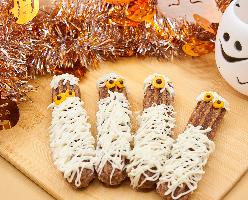1で冷ましたミニチュロスに、ホワイトチョコソースペンで網掛けをし包帯を描く。