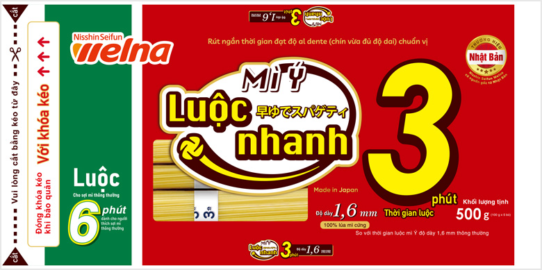消費者調査から、ベトナムの消費者はやや柔らかい食感を好む傾向にあることが分かりました。そのため、アルデンテ食感が楽しめる基本のゆで時間「3分」に加え、パッケージの表面にはゆで時間「6分」を併記し、食感のお好みに合わせてお楽しみいただけるようにしました。