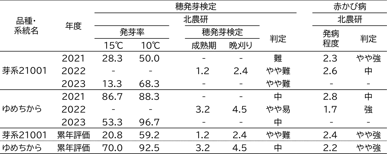 表1.「芽系21001」の穂発芽耐性および赤かび抵抗性