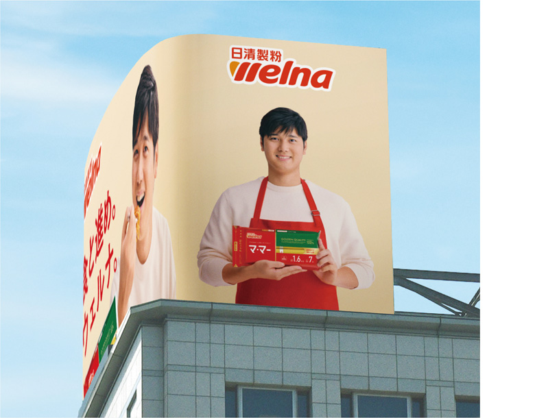 パスタカテゴリーNo.1※1の「マ・マー」ブランドのパスタをおいしそうに食べる、パスタ好きな大谷選手が屋上広告看板に初登場。同看板では、本年3月に発表した新CMメッセージ「食と進め。ウェルナ。」を掲げ、食の大切さや楽しさ、そして食の可能性を探求し続ける当社の企業姿勢を表現しました。当社は、食のインフラ企業として、これからも一人ひとりの食卓をもっと楽しく、そして、食を通じて健康的な毎日を支え続けていきます。